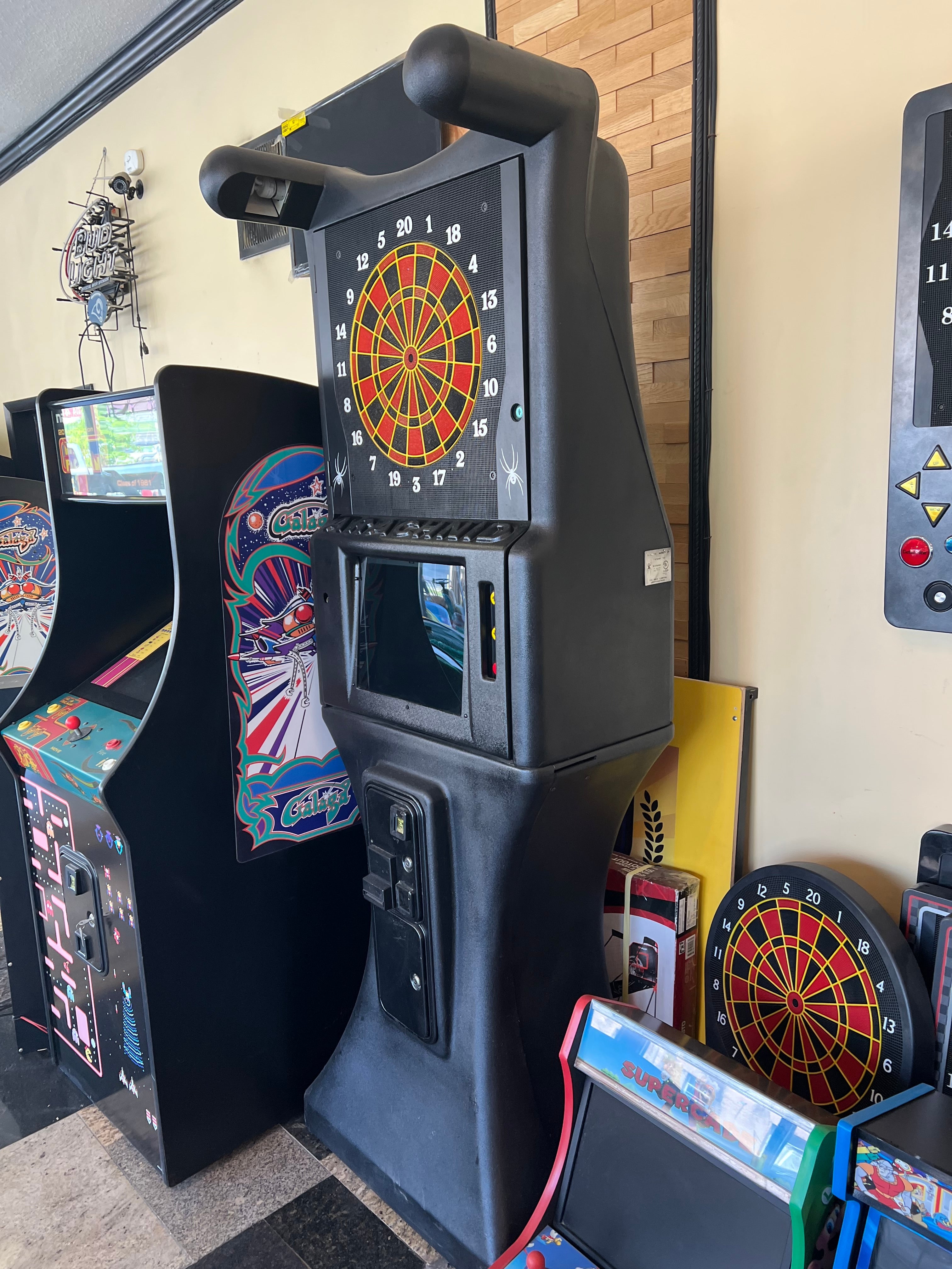 Commercial-grade, soft-tip electronic dart board with 17ā³ LCD color monitor for easy viewing. Multiple game options and customized settings Multiple machines can be networked together Accommodates 8 players Regulation target area illuminated from both sides A top choice for your home arcade Dimensions: 27W x 21D x 84H , This dart machine comes with Throwline, and 12 pieces of darts and some some soft dart tips.