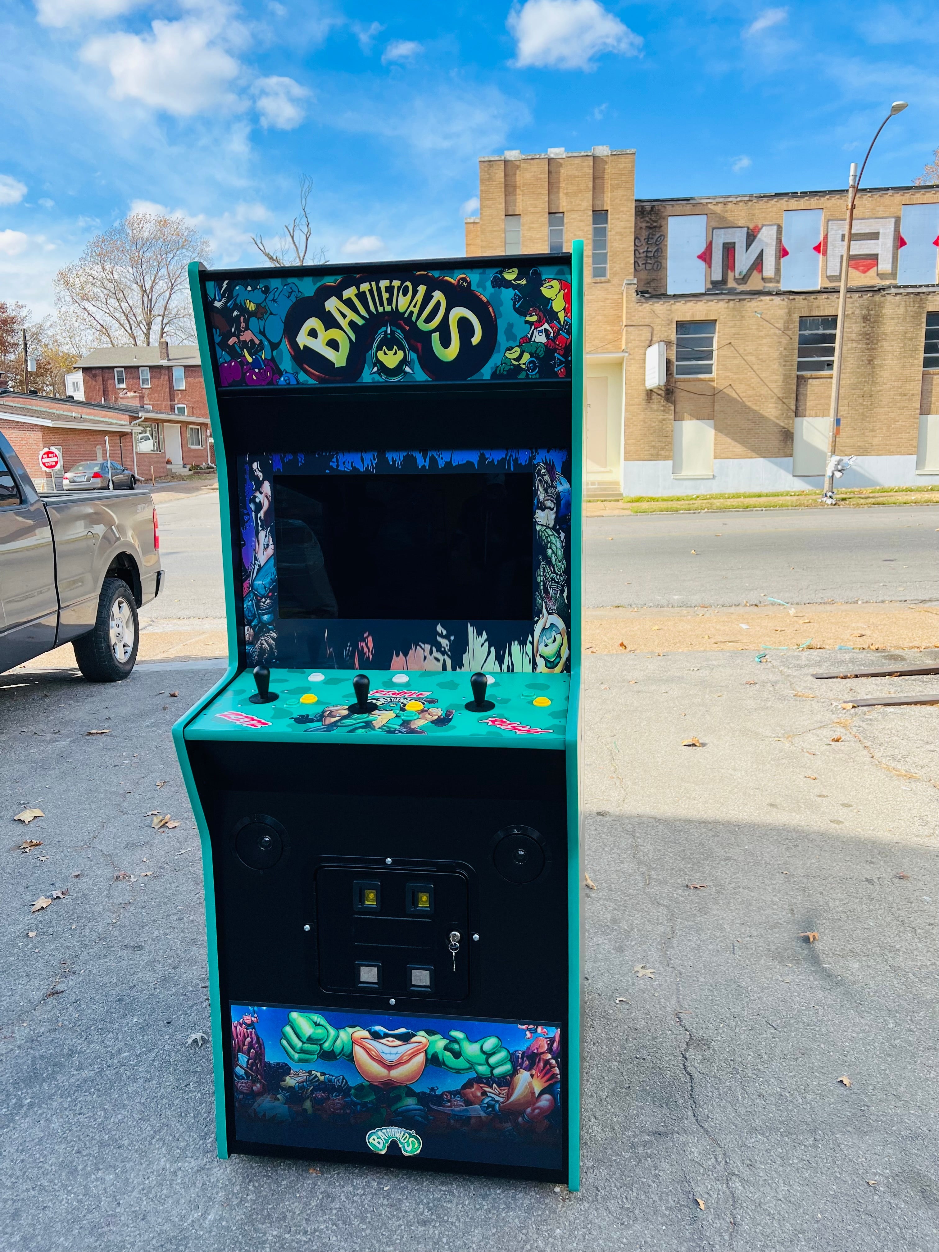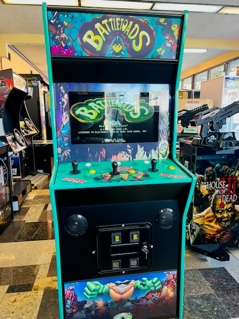 Battletoads Arcade is a coin-operated arcade game. As the Battletoads (Rash, Pimple, and Zitz) can be played Up to three players, punch and kick oncoming enemies through six levels to save their other universe from the Dark Queen. Arcade was the first Battletoads game to feature three-player multiplayer. Players can control their characters with eight-directional joysticks and two buttons. The Toads vary in fighting style: Rash is nimble, Pimple is burly, and Zitz is a balance of the two. As standard for the series, the Toads can knock enemies off-screen such that they appear to fly towards the players. The Toads can also eat flies to regenerate health. Each Toad has its own signature boosted power and attack, in which their limbs turn into objects such as axes and drills.