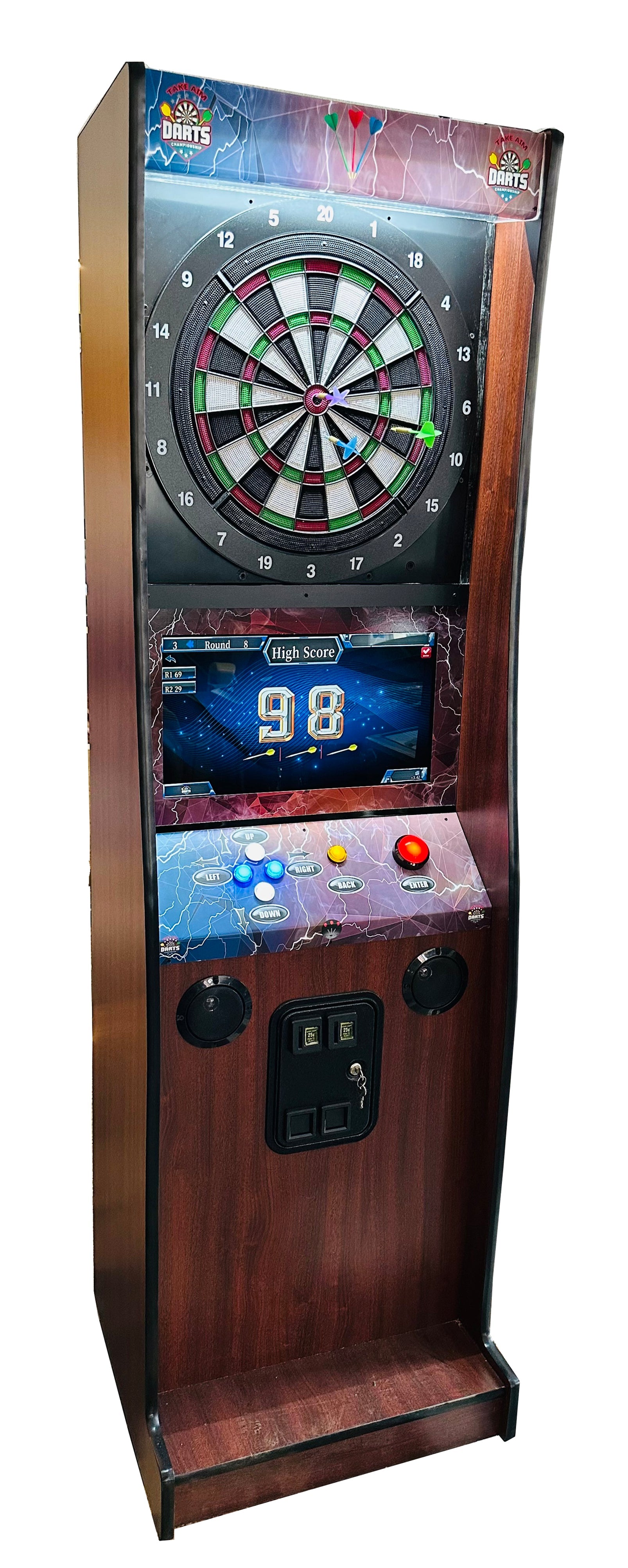 This Dart Machine is also available in walnut wood grain, white or black cabinet. We can also customize your cabinet with your own logo ( for extra charge ) such as your Lounge name, Restaurant name, your Personal name or any other logo of your favorite. This game is coin operated however you can set it on free play as well.