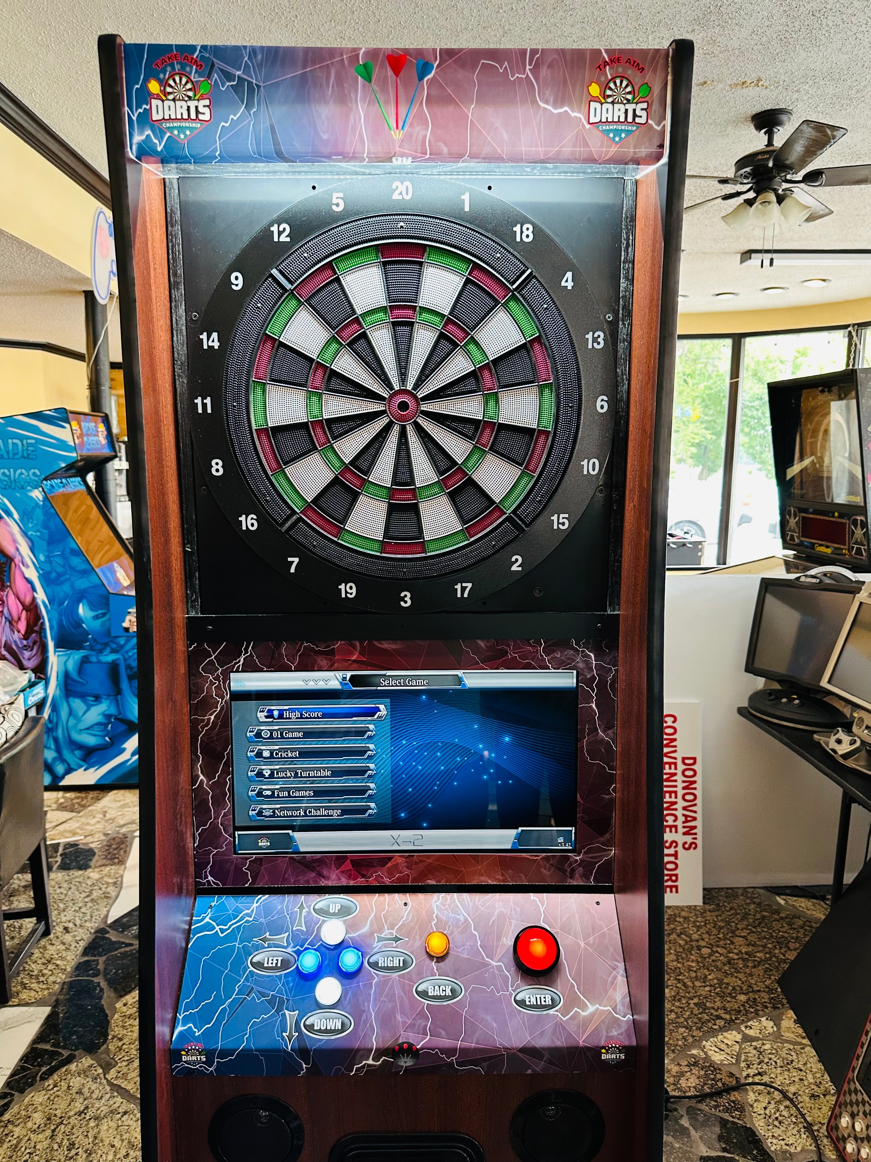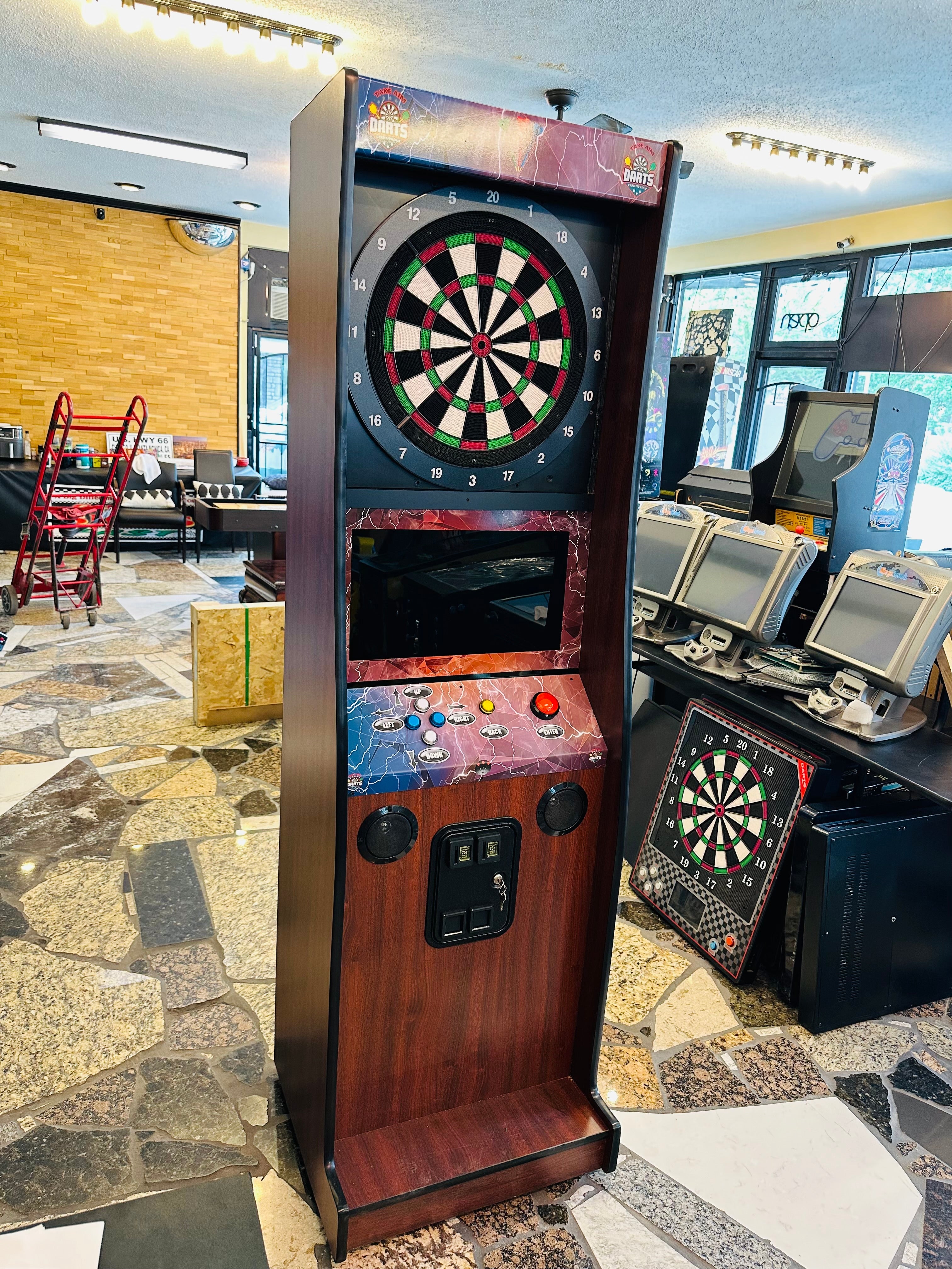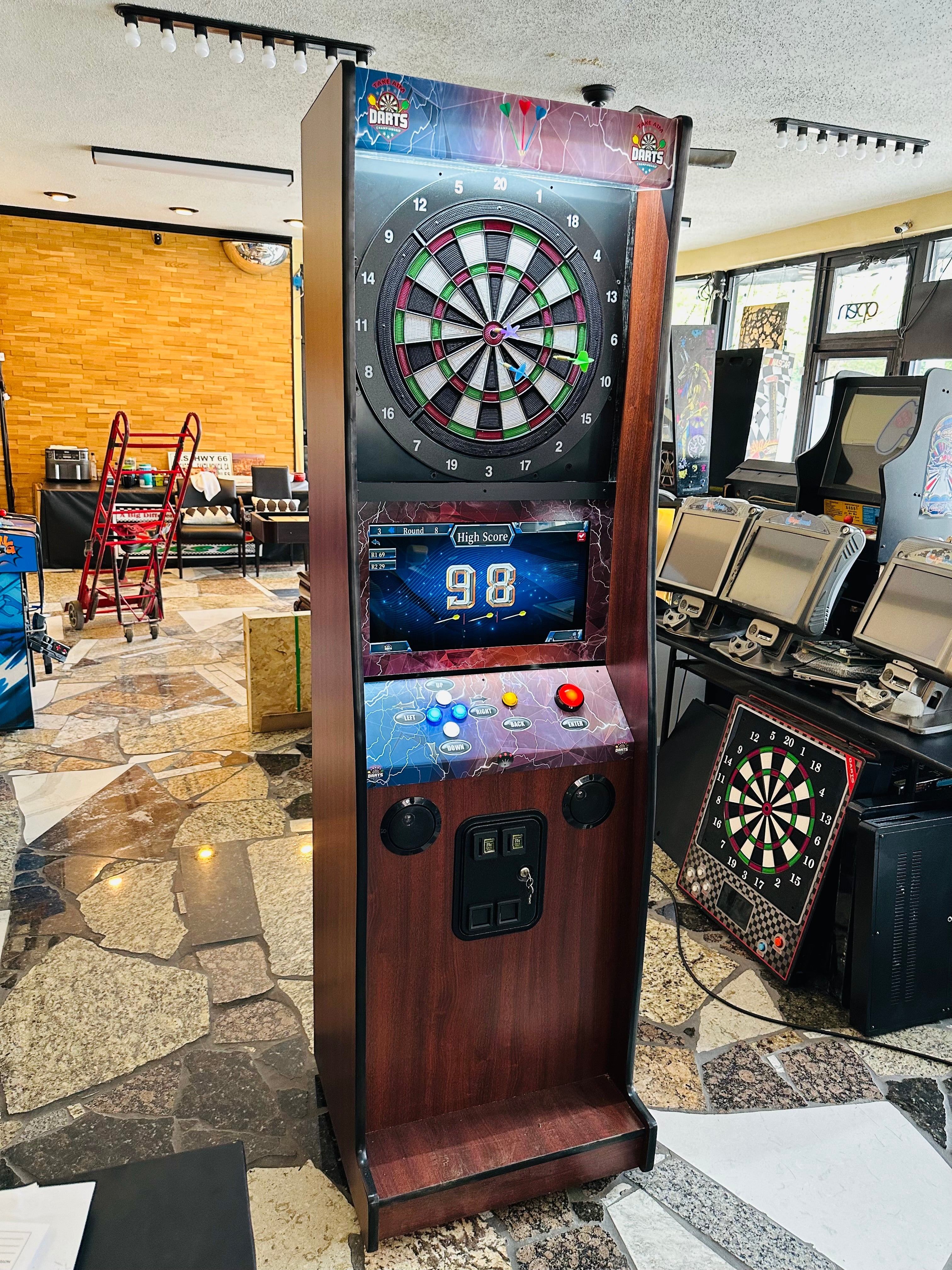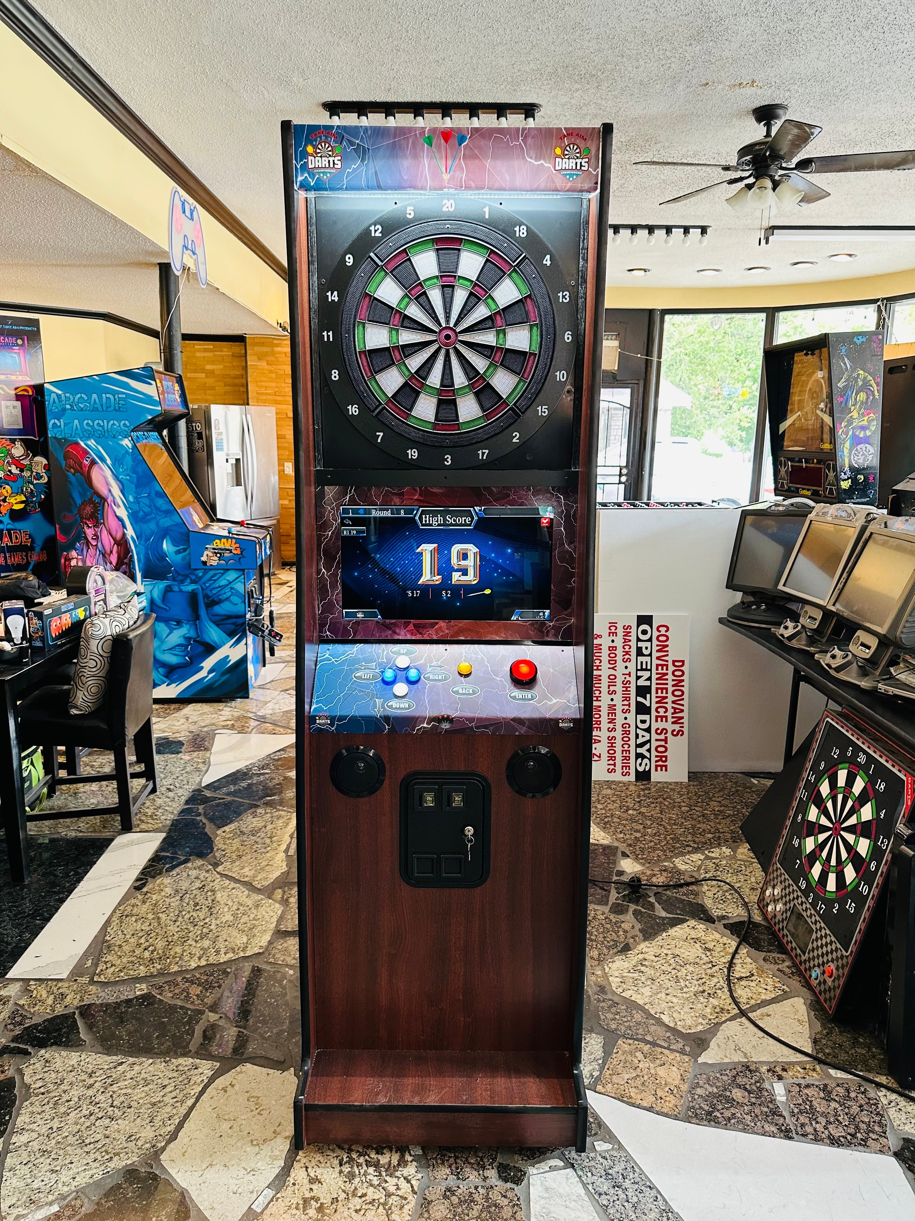 IntroducingĀ the most affordable electronic dart machine. This heavy duty dart game is suitable for arcade games operators. You can install this modern dart game in Bars, Restaurants, Entertainment Centers and many other locations to earn profit. It is also suitable for home use. You can easily set up the pricing by going to set up menu. Unlike the old dart games, service is very easy in case of break down.Ā Dollar Bill Validator Acceptor is optional for extra cost.