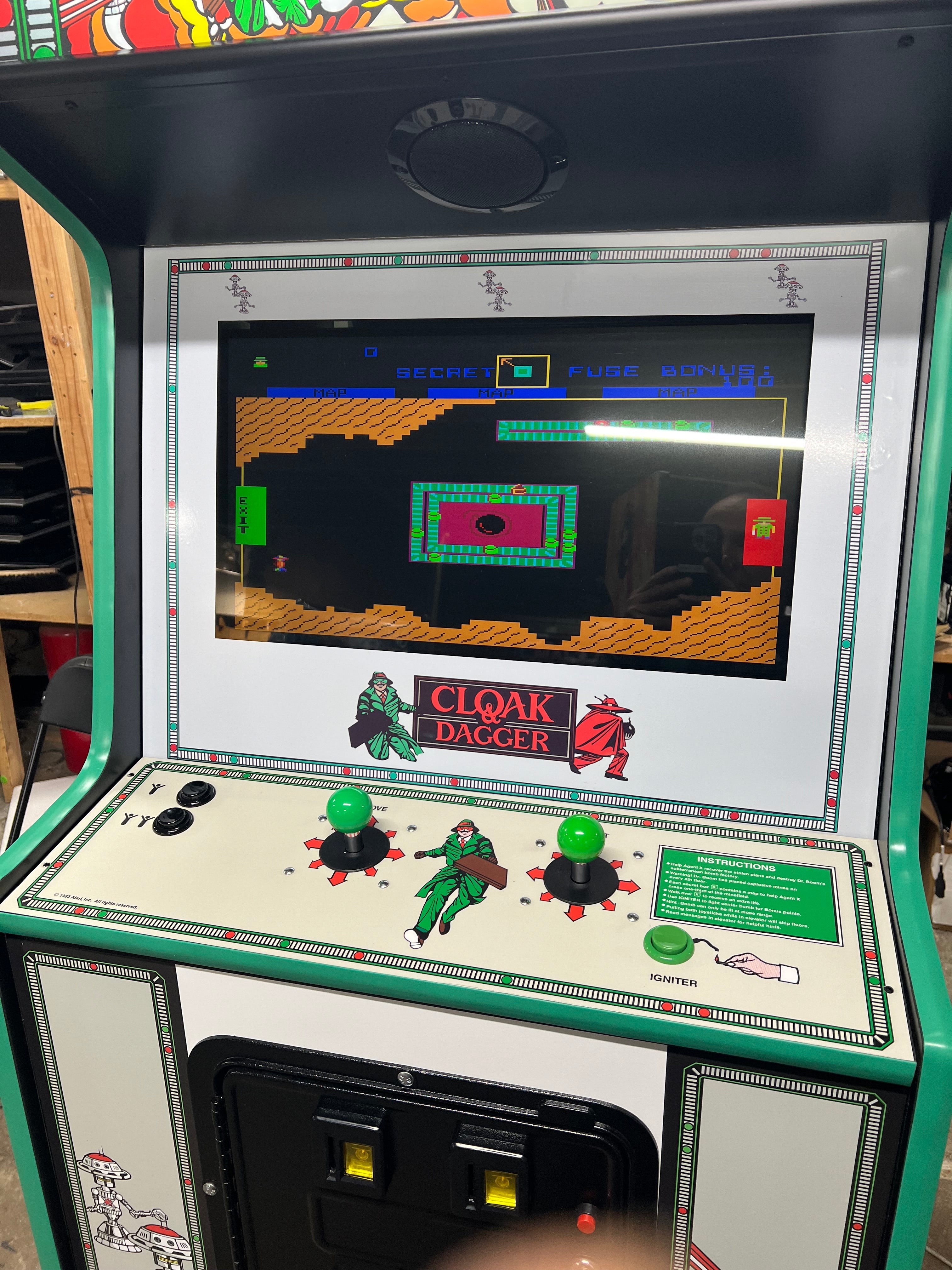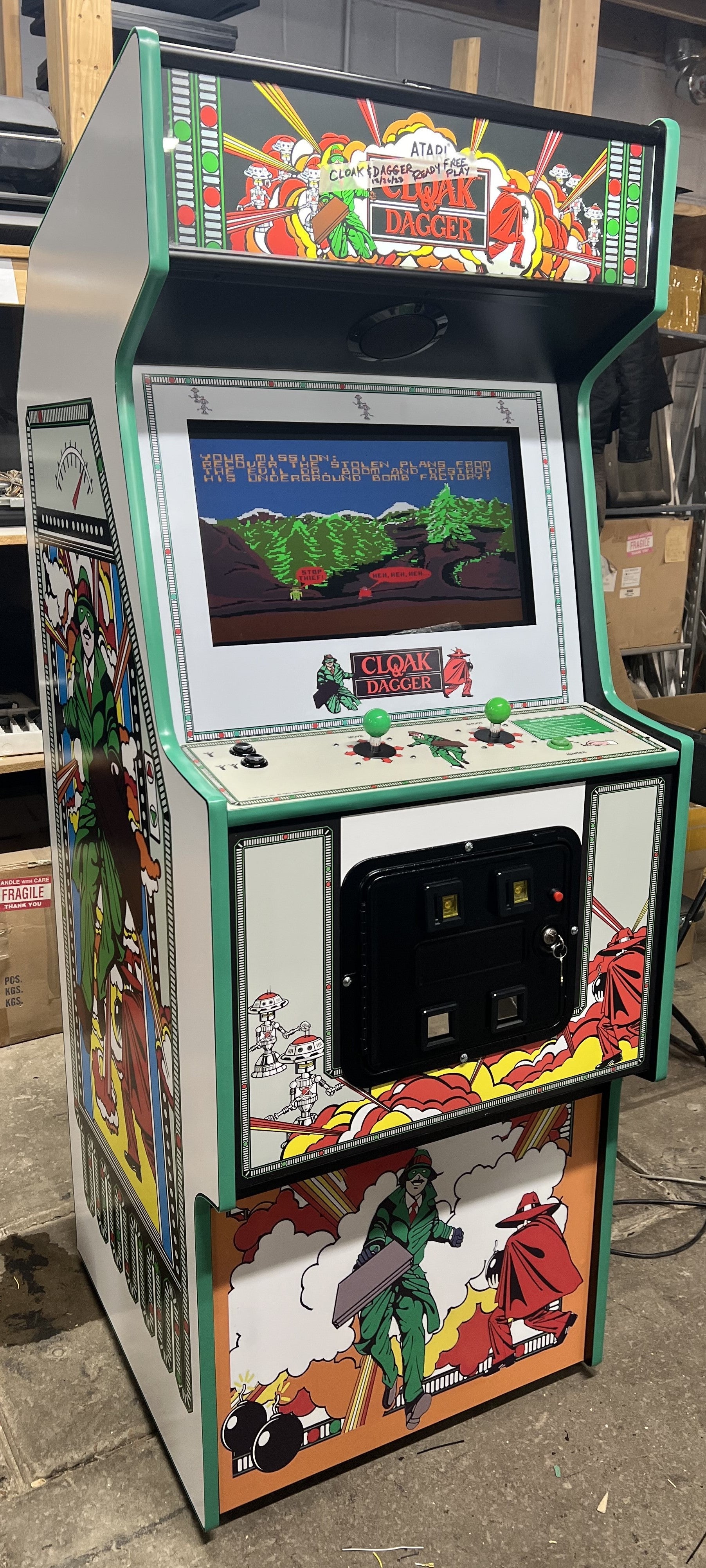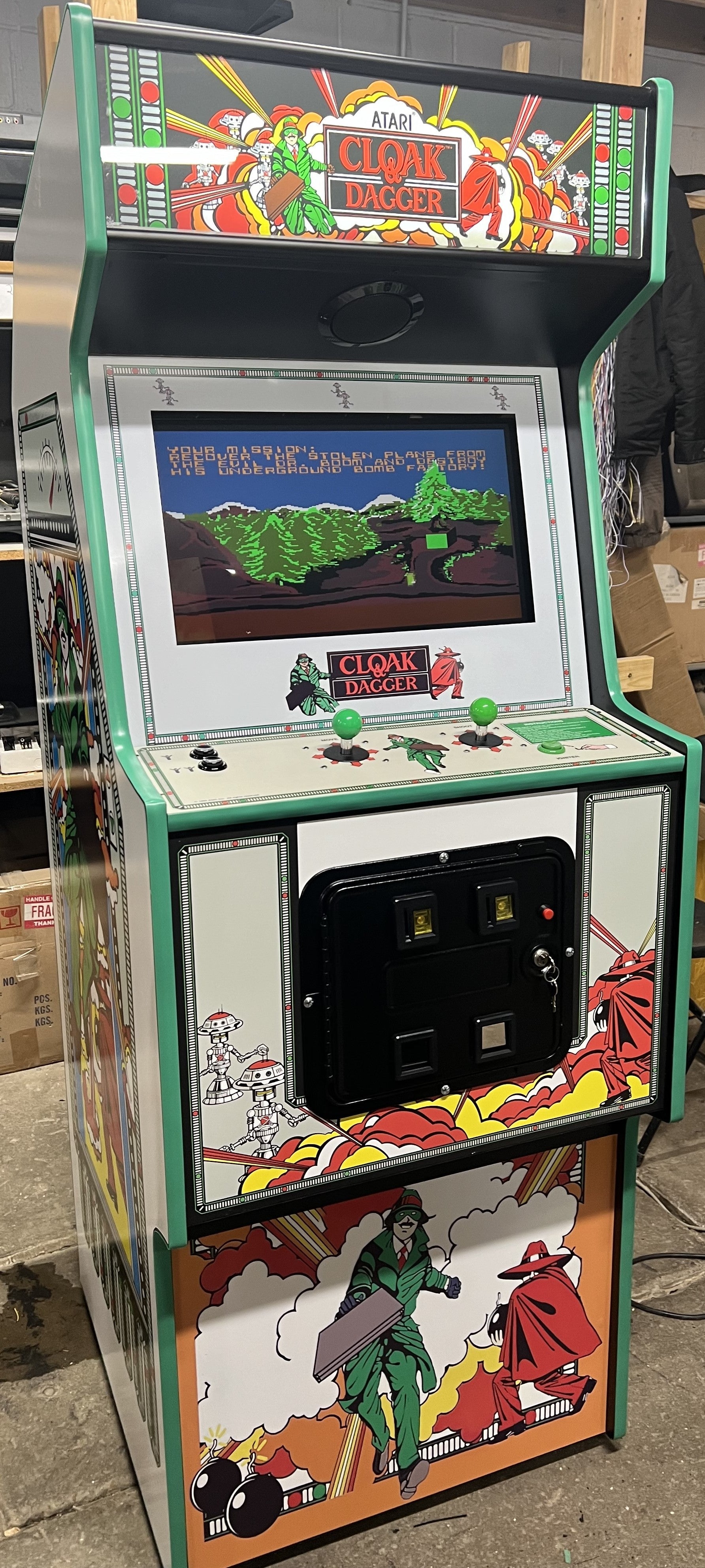 Cloak & Dagger is an arcade video game released by Atari, Inc. in March 1984 as a tie-in to the 1984 film Cloak & Dagger. The game saw limited arcade release as a conversion kit for Robotron: 2084 cabinets. The game was created by Russel Dawe. The game was under development using the title Agent X when the movie producers and Atari learned of each other’s projects and decided to cooperate. When Atari was consulted to provide a game as an element of the movie, they tweaked Agent X and renamed it Cloak & Dagger. Dabney Coleman’s character was named “Jack Flack” in the movie in lieu of “Agent X”. The film shows an Atari 5200 version of the game, but the cartridge props are actually other 5200 games with a Cloak & Dagger label stuck on them and the screenshots are of the arcade version.Ā
