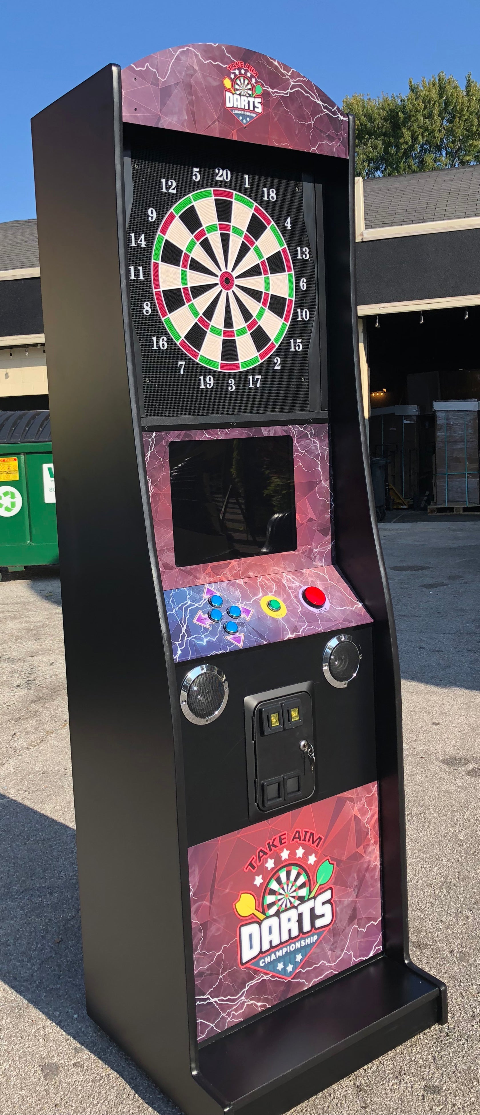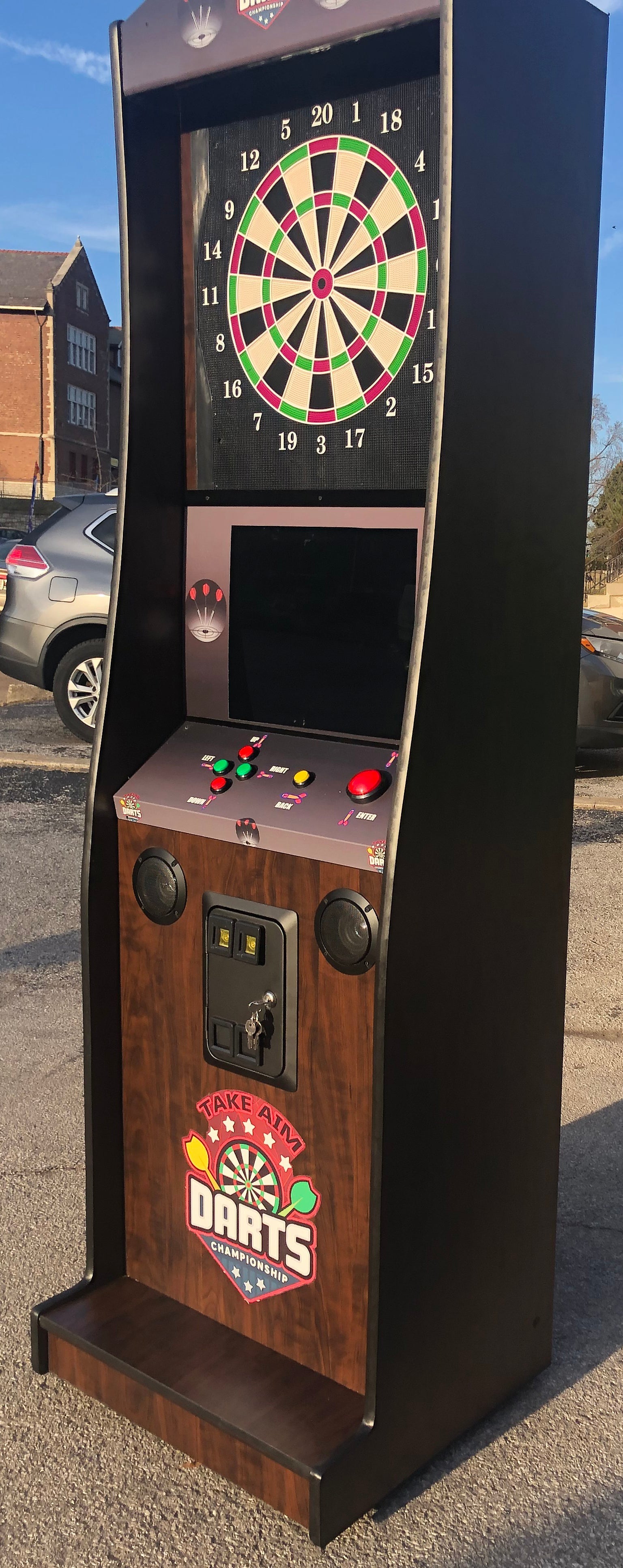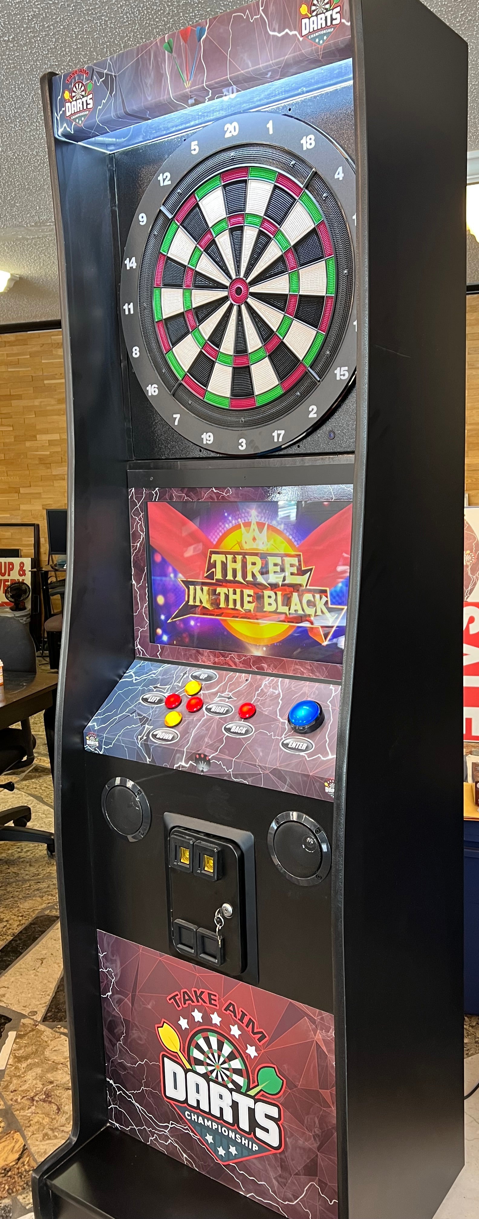 This Dart Machine is also available in walnut wood grain, cherry wood grain, white or black cabinet. We can also customize your cabinet with your own logo ( for extra charge ) such as your Lounge name, Restaurant name, your Personal name or any other logo of your favorite. This game is coin operated however you can set it on free play as well.
