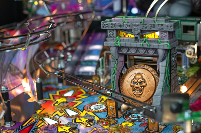 King Kong: Myth of Terror Island is a four-flipper pinball machine featuring exciting gameplay and challenges. Players explore the Lost Temple by hitting targets and navigating the Kong Cave. Enter “The Pit” on Terror Island, where a giant spider sculpture uses magnets to grab and attack the ball, creating a challenging obstacle for players. The game includes original animations, sounds, and voices from well-known artists and actors like Brian “Q” Quinn.