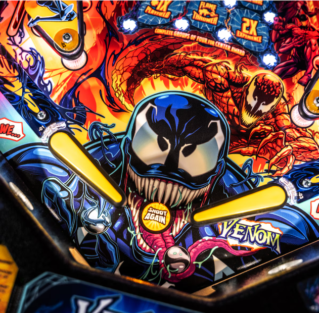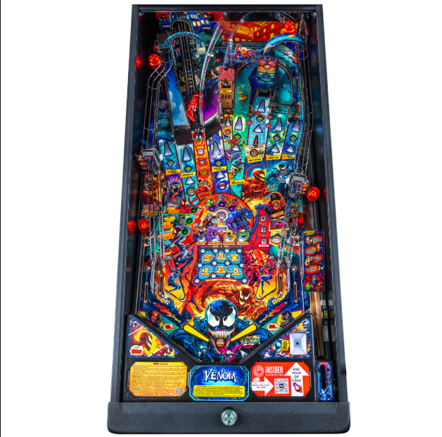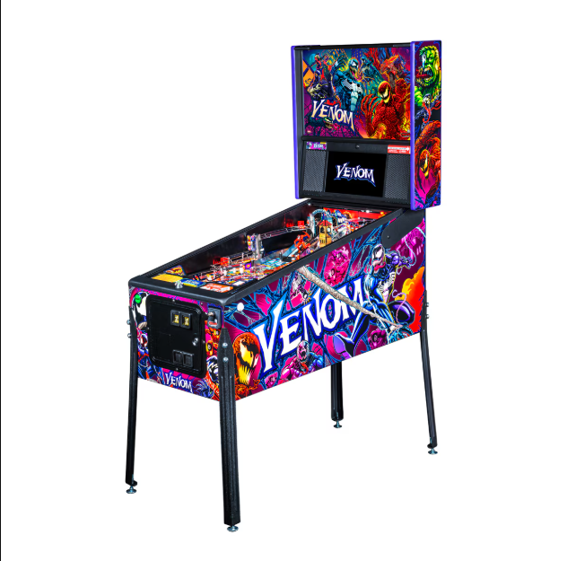 - Venom-themed pinball machine officially licensed by Marvel.
