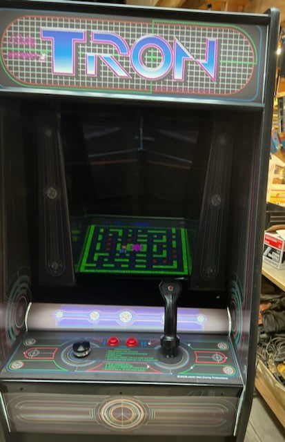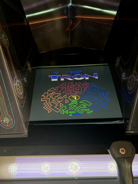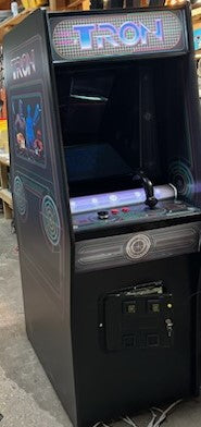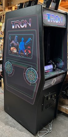 Tron consists of four sub-games based on events and characters in the movie. In general, the player controls Tron, either in human form or piloting a vehicle, using an eight-way joystick for movement, a trigger button on the stick to fire and a rotary dial for aiming. The aim of the game is to score points and advance through the game’s twelve levels by completing each of the sub-games. Most of the 12 levels are named after programming languages. The game supports two players alternating.